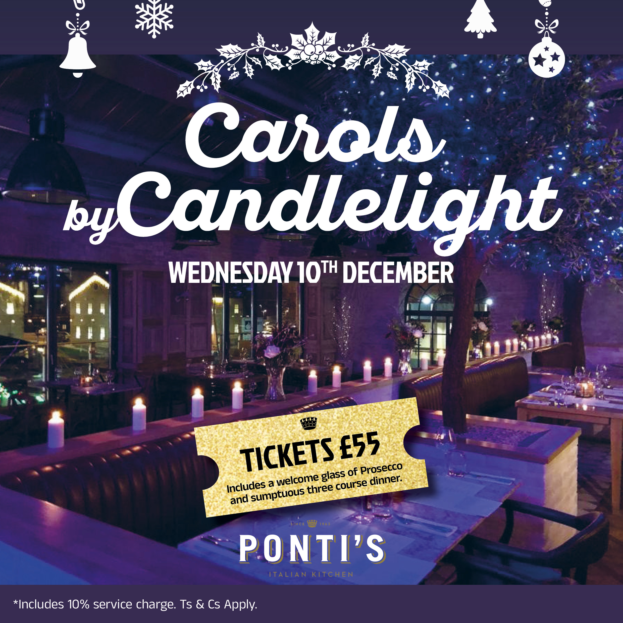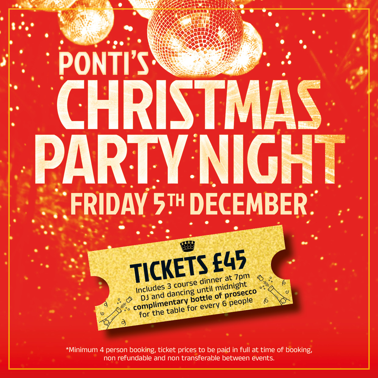 A delicious 3 course menu featuring Christmas classics with our Ponti's Italian twist such as roast turkey wrapped in Pancetta and toasted Panettone with vanilla cream custard.